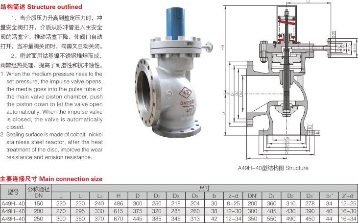 A49H-40型主安全閥主要用于電站鍋爐、壓力容器、減溫減壓裝置設備,防止壓力超過允許z高壓力值,保證設備安全運行。